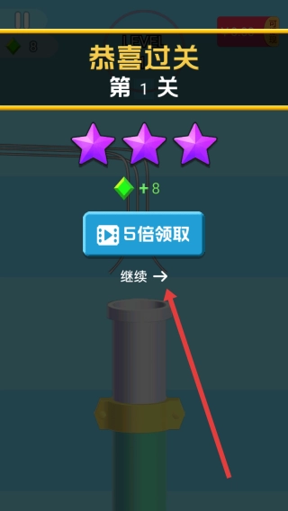 2、过关后,可以通过点击【继续】,进入下一关,或选“5倍领取”(看广告)获取更多奖励。