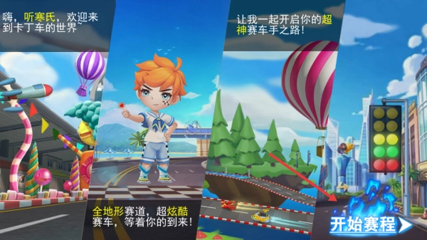 2、进入引导页,了解“全地形赛道”等信息,点击“开始赛程”,正式进入游戏,熟悉赛道环境。