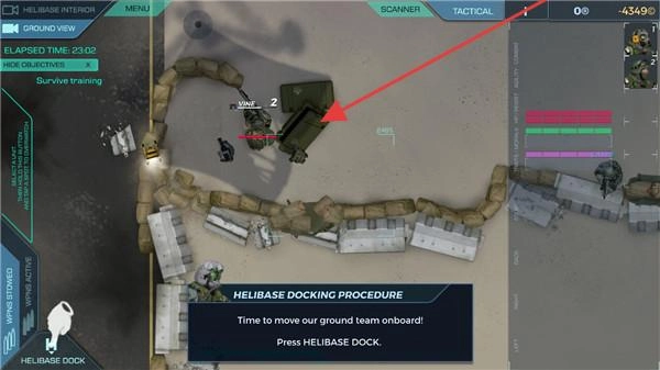 2、战场地图,按箭头指引,移动部队到指定区域(绿色掩体),执行“HELIBASE DOCKING PROCEDURE”任务,推进流程。