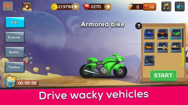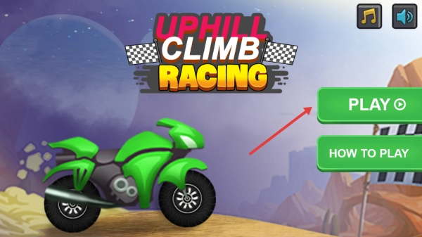 1、在主界面找到并点击【PLAY】按钮,进入车辆选择页面后,挑选已解锁的摩托车,接着点击【START】即可开启登山竞速模式。