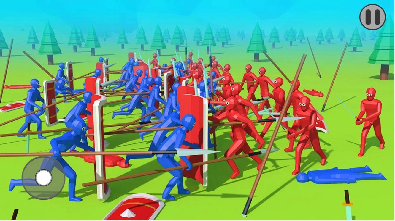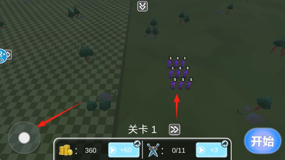 3、战斗操控用左侧摇杆指挥己方(紫色兵种)移动,点击“开始”,与敌方部队对战,推进关卡。