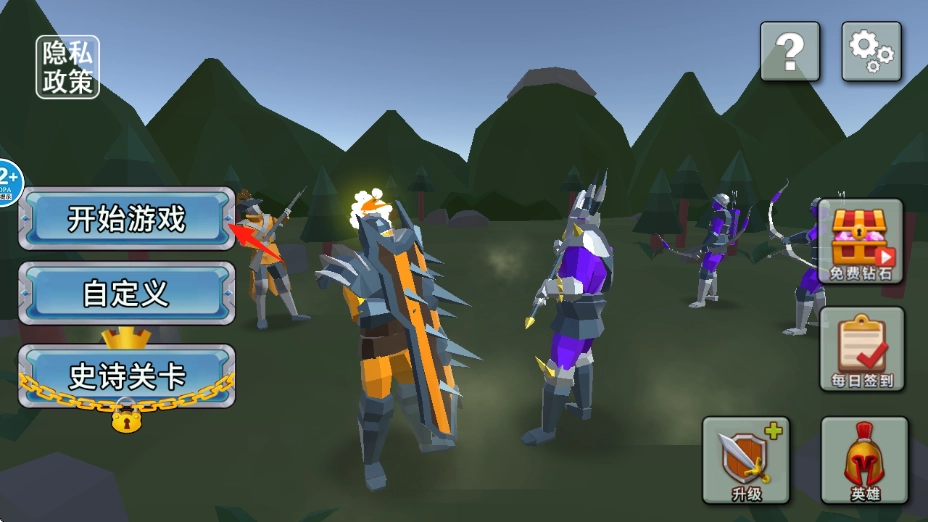 1、模式选择:点击“开始游戏”进入关卡,或选择“自定义”编辑阵容、“史诗关卡”挑战高难度。