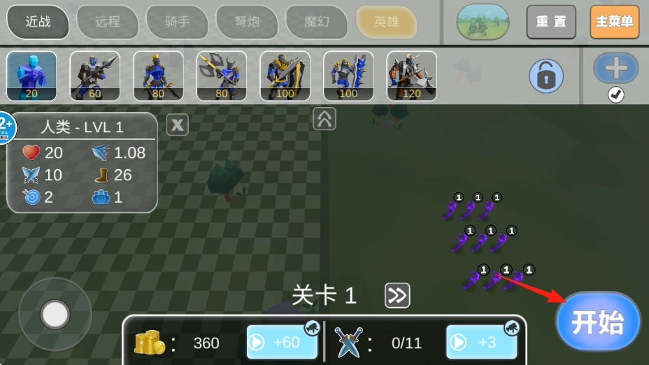 2、兵种布置在“关卡1”选近战、远程兵种(人类、骑士),消耗金币(360)部署部队。