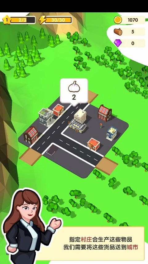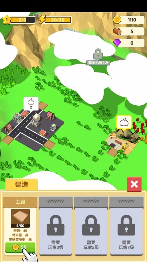 6、城市升星还需用到建筑材料,点击地图上的绿色树木,即可砍伐,砍伐到一定数量,便可将树清理掉,同时也能获得建筑材料。在往后的道路建设中,同样需要依靠这样的操作,清除阻碍。
