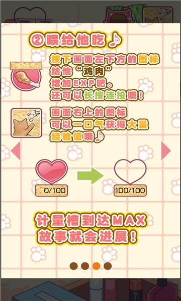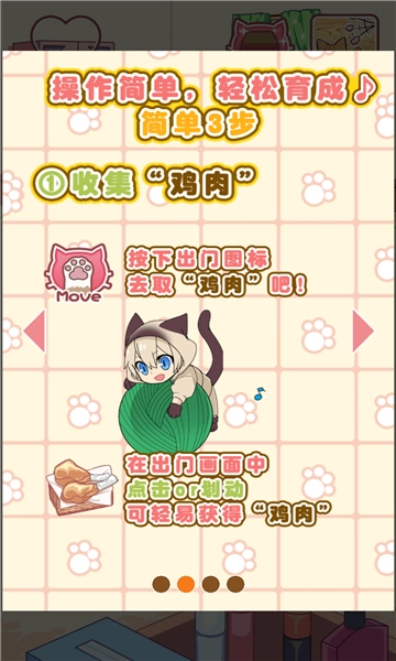 1.游戏的玩法相当的简单,进行放置收集鸡腿,给猫耳少年进行喂食,进行升级变化不同的形态。