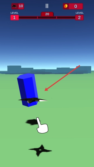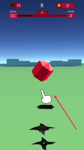 2、根据白色手指指引,拖放飞镖,射向红色立方体,每中一次,减敌方“LEVEL2”进度。