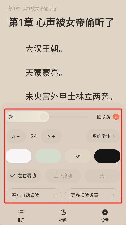 5、最后可以在阅读设置中调整字体大小、颜色、背景等参数,以满足个性化需求。