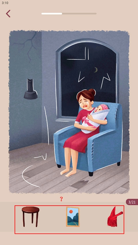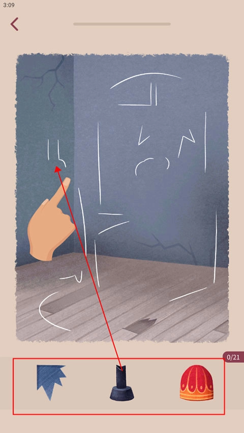 1、进入游戏,将下面物品,随着上面的白线形状轮廓填充上去;