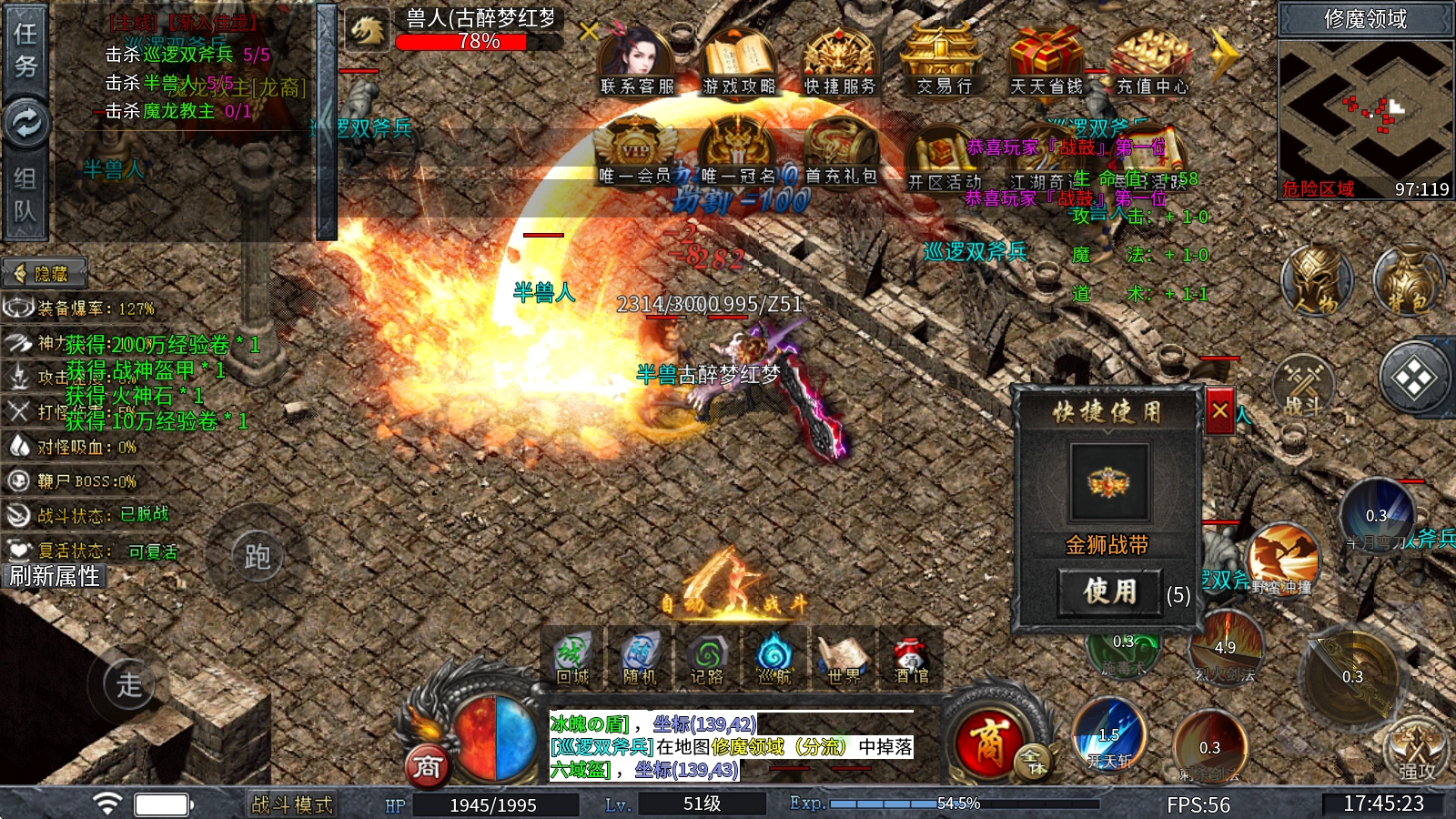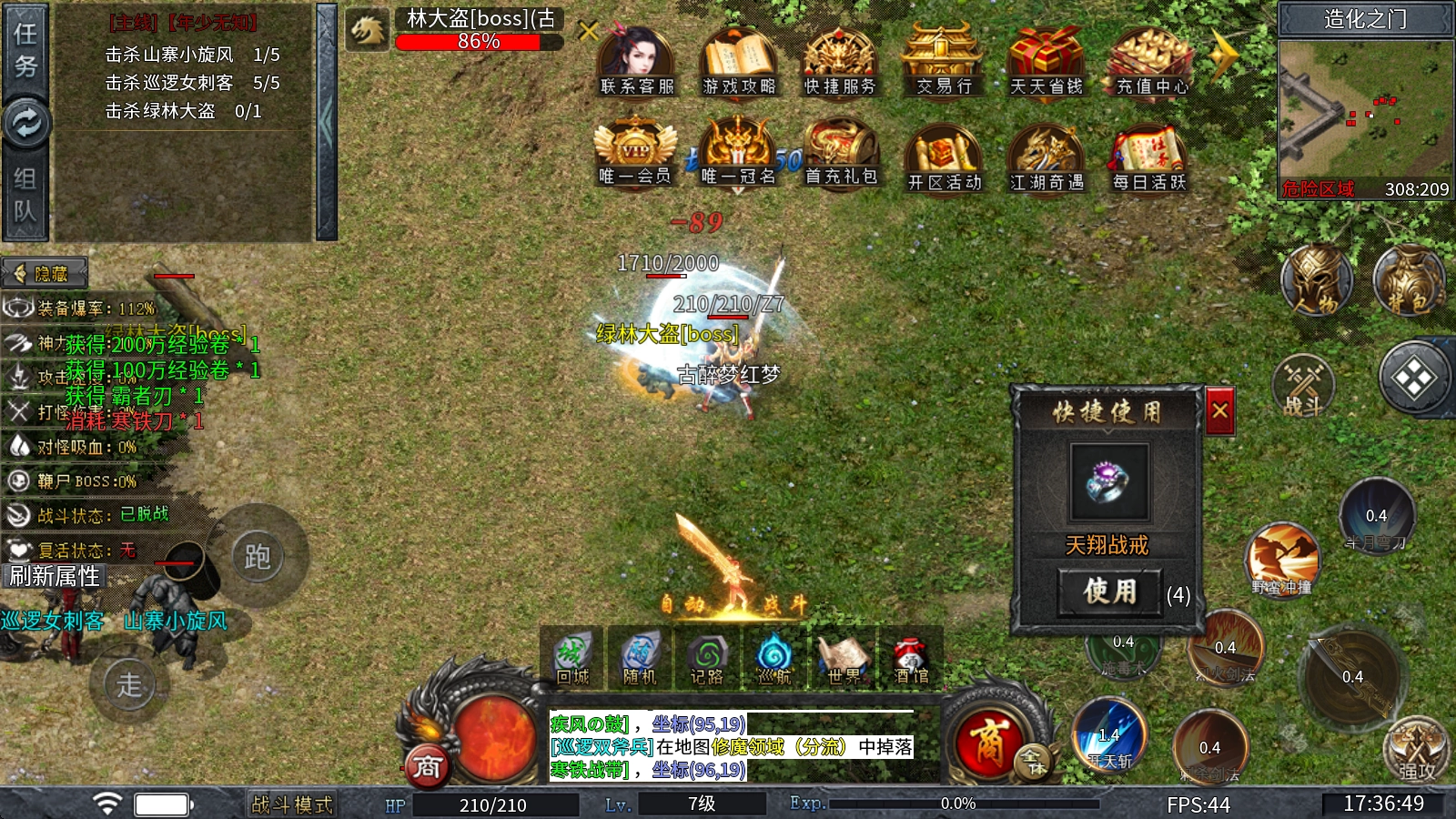 3、上线做到人人平等,所有装备材料全爆出,时间就是一切,只要你有时间就可玩到终极!