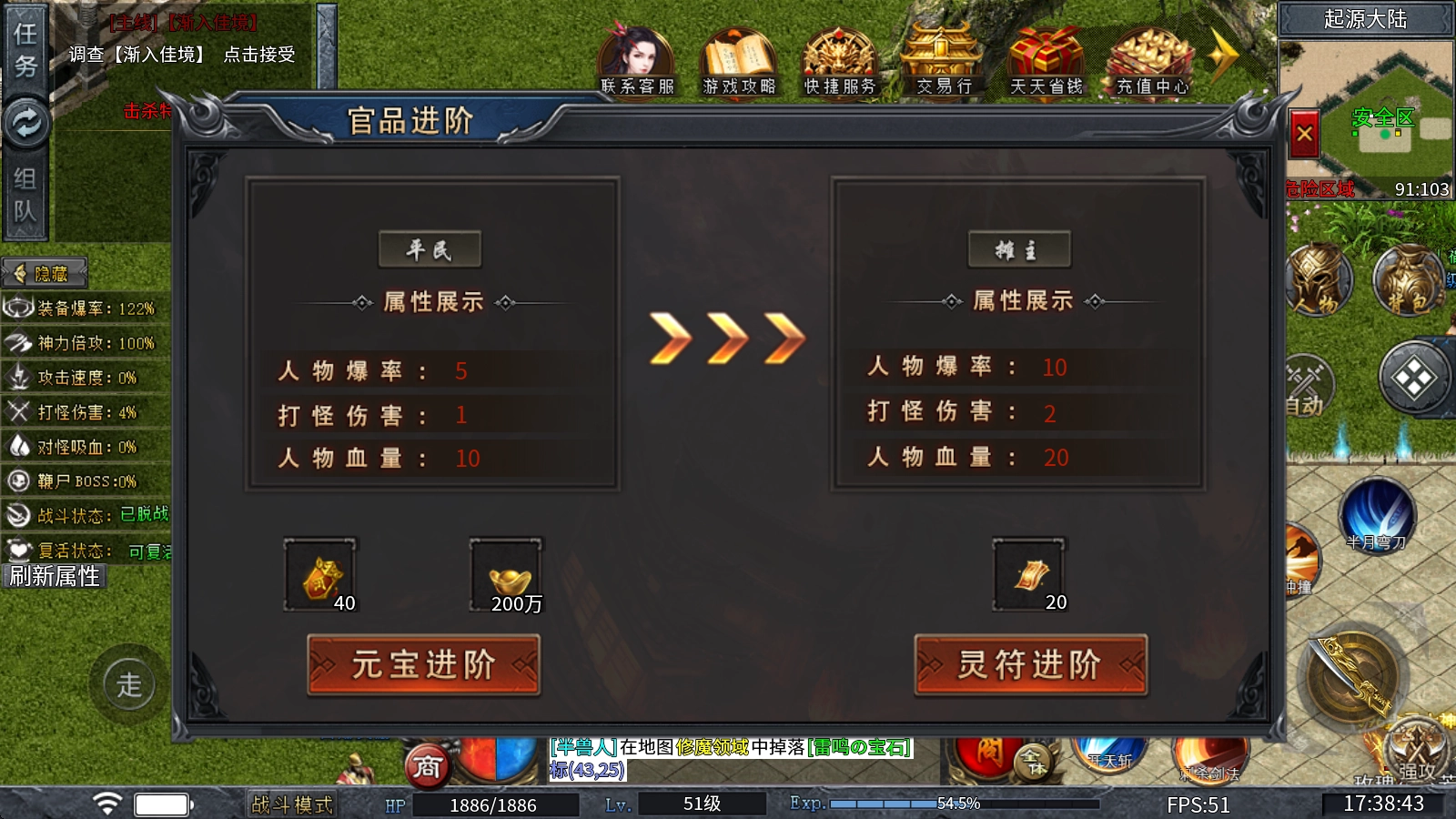 1、官品进阶:消耗天关令牌和元宝进行进阶,每一级都能提高打怪伤害和人物血量,并且还会增加人物爆率,天关令牌可以通过分解普通装备获得。