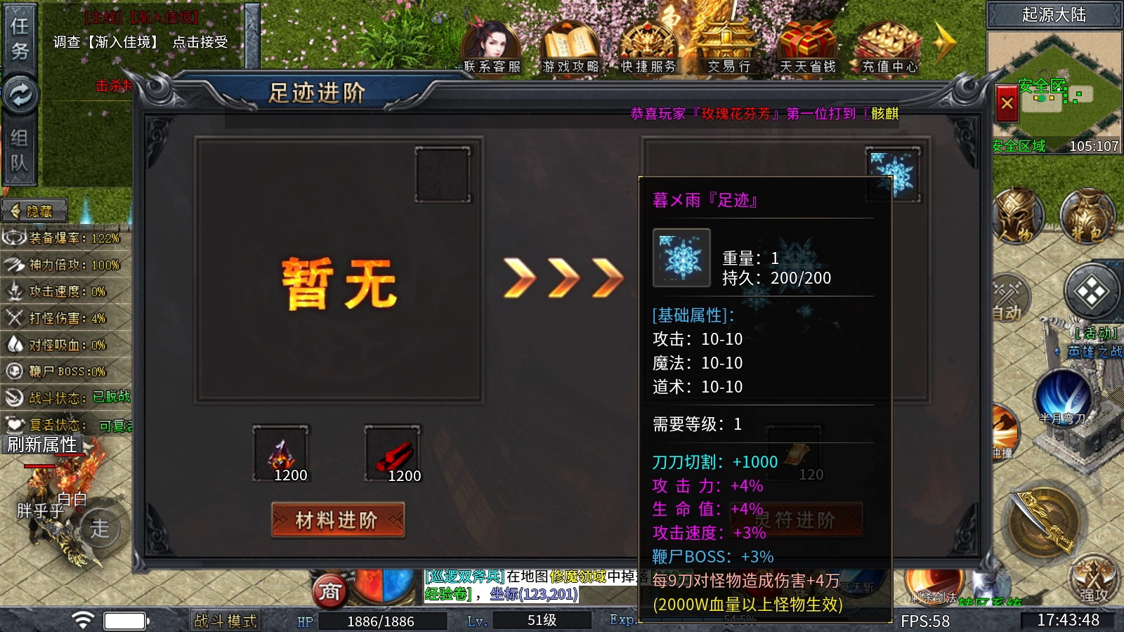 5、足迹进阶:消耗火神石和龙血木即可进阶,不仅造型炫酷,属性也非常强大,尤其对切割的提升最大!