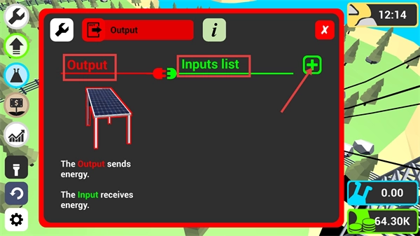 2、进入【Output】界面,明确【Output】负责发送能量、【Inputs-list】负责接收能量,点击界面中的加号按钮,配置能量传输的连接关系。