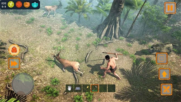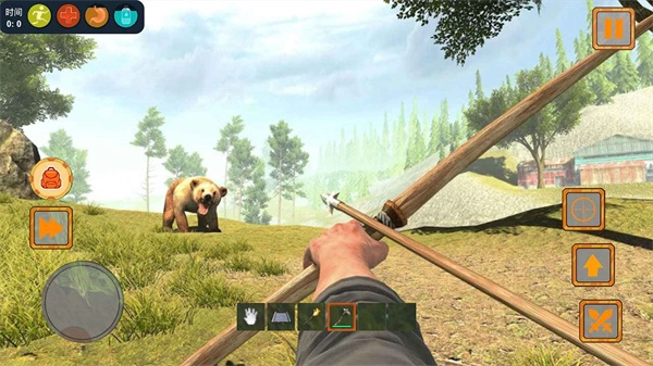 1、操控虚拟摇杆移动角色,靠近场景中的道具如木弓。