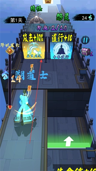 击败敌人后,选择“道行+10”的增益效果来增强角色属性,随后继续推进第一关的进程。