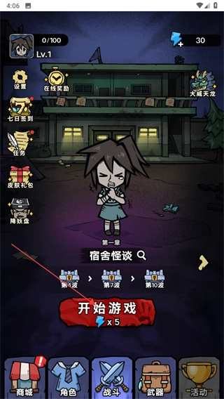 游戏主界面呈现的是第一章“宿舍怪谈”,左侧排列着设置、签到等功能按钮,点击底部需消耗5个闪电的“开始游戏”按钮,就能开启该章节的关卡进程。
