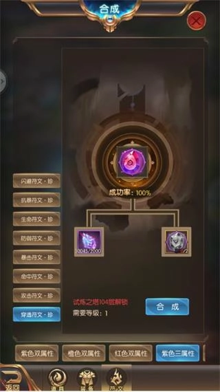 随着通关试练之塔层数的提升,玩家可以佩戴更高级的符文,同时开放更多符文功能,如符文合成。在这里可以通过使用单属性符文合成双属性(精)与三属性(珍)的高级符文。这意味着一个符文槽就能提供两到三中属性的加成!