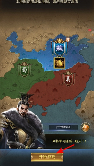 1、在游戏启动界面,点击开始游戏按钮即可进入三国题材的策略玩法,这是开启势力发展与领地扩张的基础操作,后续可通过招募武将推进统一进程。