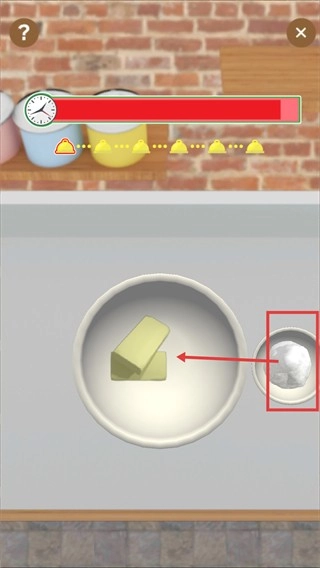1、进入料理制作环节后,请注意观察顶部的【时间条】,点击红框范围内的【材料】,把它移动到容器里的黄油旁边,以此推进该步骤的制作流程。