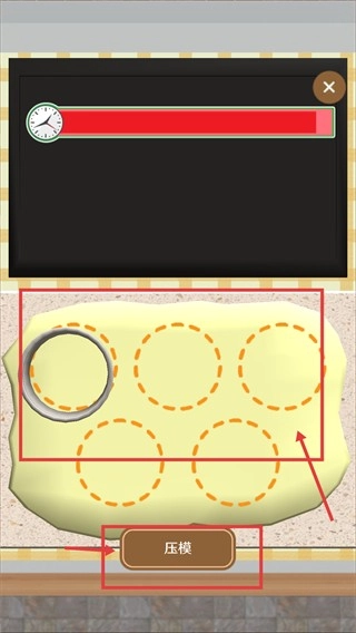 3、进入压模环节,定位红框内的【压模】按钮,点击后按红框内的圆圈轮廓,压出对应形状的面皮,完成该步骤制作。
