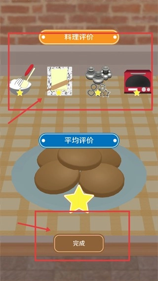 4、看到【料理评价】界面及工具评分后,点击红框内的【完成】按钮,结束本次料理制作流程,确认最终的制作结果。