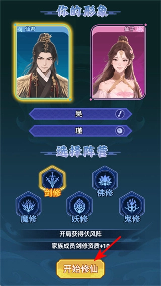1、在形象与阵营选择界面,确定好形象和阵营后,点击“开始修仙”按钮即可开启修仙玩法,这是踏入仙途、创建家族势力的基础步骤。