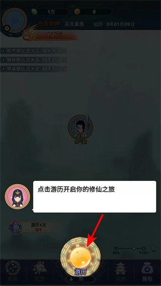 2、进入主界面后,点击游历按钮可开启修仙探索流程,这是获取资源、触发事件的核心操作,持续游历能推进仙途进度、解锁更多玩法内容。