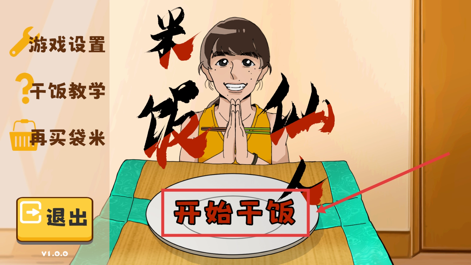 1、进入游戏主界面后,点击【开始干饭】按钮,挑选合适的游戏难度,就能进入干饭闯关环节,开启你的米饭仙人挑战之旅。