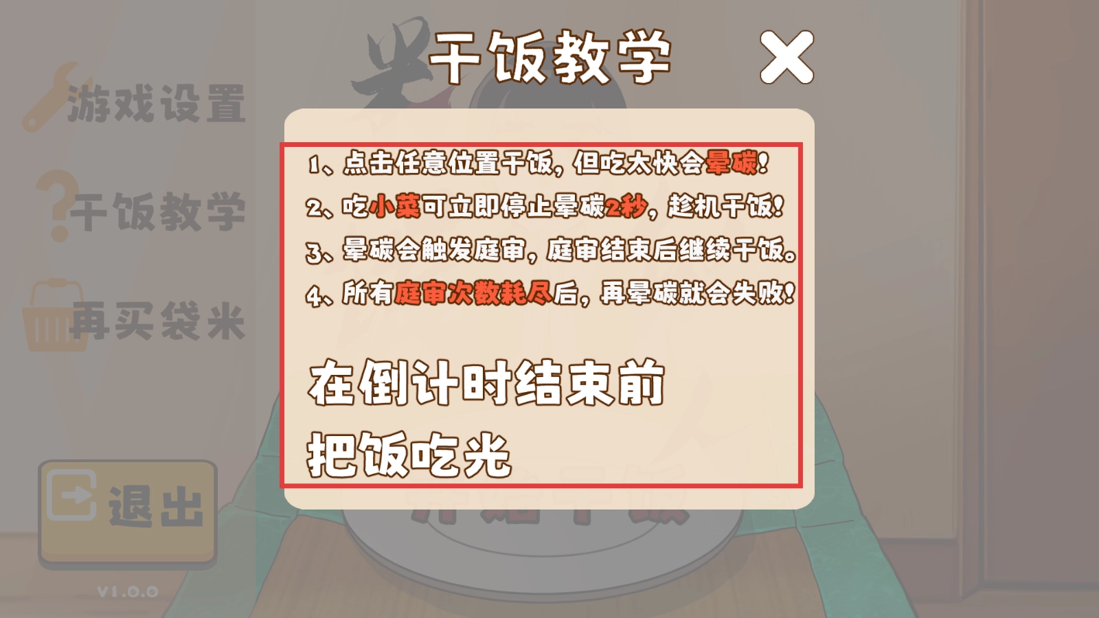 2、在干饭教学界面,仔细阅读四条核心规则,了解晕碳、小菜作用及庭审机制,为高效干饭和避免失败做好准备。
