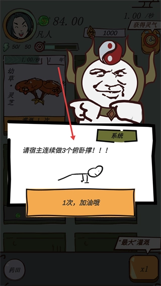 1、按照【系统】的指引点击【1次,加油哦】按钮,完成初期任务来获取修真需要的基础资源。