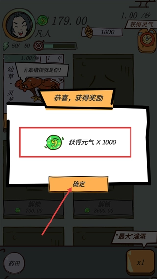 4、完成操作后点击【确定】按钮,领取【元气X1000】奖励用于后续修真发展。