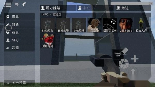 4、点击右边“手枪”按钮拿枪,可以让角色切换到持枪状态,中心用于开枪,+号可以新增靶子角色。