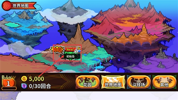 3、在【世界地图】界面找到【初始岛】,当前【B-lv-1】持有【5000】金币,可借助【花园】【世界地图】等按钮开启后续冒险。