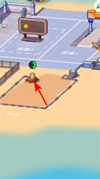 1、点击场景里带有金币标识的土堆这类资源堆,就能得到12k金币之类的对应资源,为之后的升级提前做好准备。