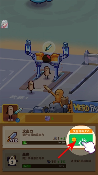 3、紧跟红色箭头指引,点击资源按钮消耗金币,可升级士兵的属性如攻击力,提升战斗能力。