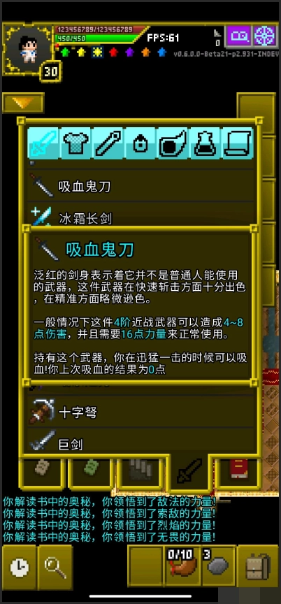 4.尚方宝剑 需要用升级棱晶+冻肉+炼金催化剂合成(4阶),伤害很高且攻击会令视野内所有敌人流血+寒冷;每进入下一个大区+1力量需求并增加伤害值