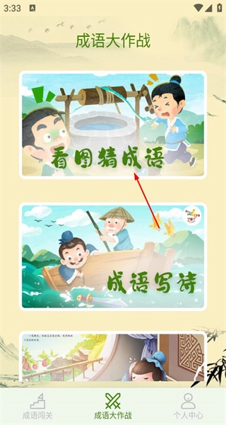 4、登录完成后返回主界面,点击底部成语大作战按钮,选择看图猜成语玩法开启挑战。