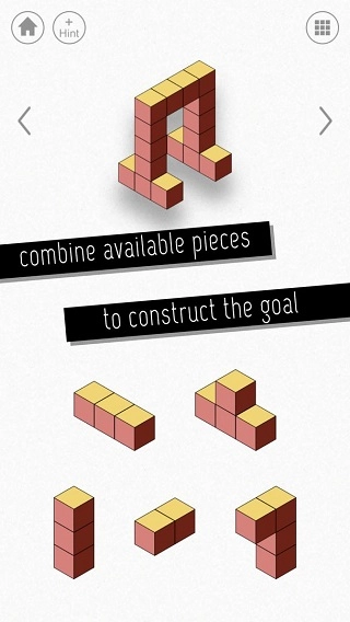 2、游戏中的方块可以进行叠加和融合,玩家需要利用这些特性,在二维的画板上创造出三维的视觉效果,从而完成关卡目标。