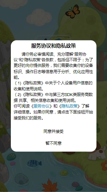 1、首次进入游戏后,需要仔细阅读并同意游戏的隐私政策与服务条款。