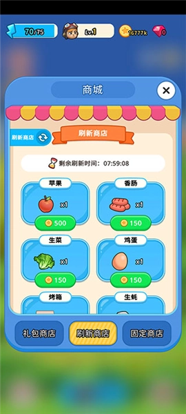 3、左下角是按钮是商店,点击按钮可以购买各种食材,主要用于烹饪食物,而烹饪秘方可以在关卡中触发不同剧情和角色获得。