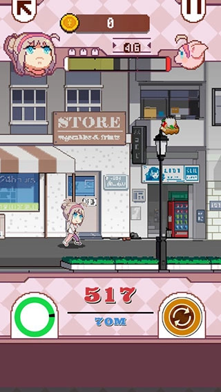 击手机金币,金币可以解锁人物或者购买buff。跑酷的过程中有一些恶搞的小设计。不同的人物会有不同的喜爱/讨厌的食物,目前没有看出来到底有什么区别,现在只看出来收集向的东西不一样,不知道具体的跑酷过程中有没有数值或者属性的区别。