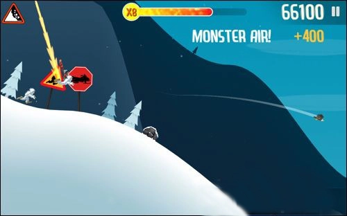屏幕左侧上方的雪崩警示牌会在雪堆即将接近时不断地闪烁以示警告,即时你已经在视野中能够看到背后奔腾而来的大雪,如果此时爬起继续滑行,那么甩掉这近在咫尺的雪堆也并非不可能。