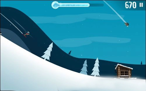 游戏屏幕上方会有此时的奖励状态,玩家通过在滑行中收集金币奖励、完成高难度动作等,可以填满奖励状态,从而激活各种高级工具例如火箭船等,还可以和企鹅、雪怪人一同搭载着火箭船奔向远方。