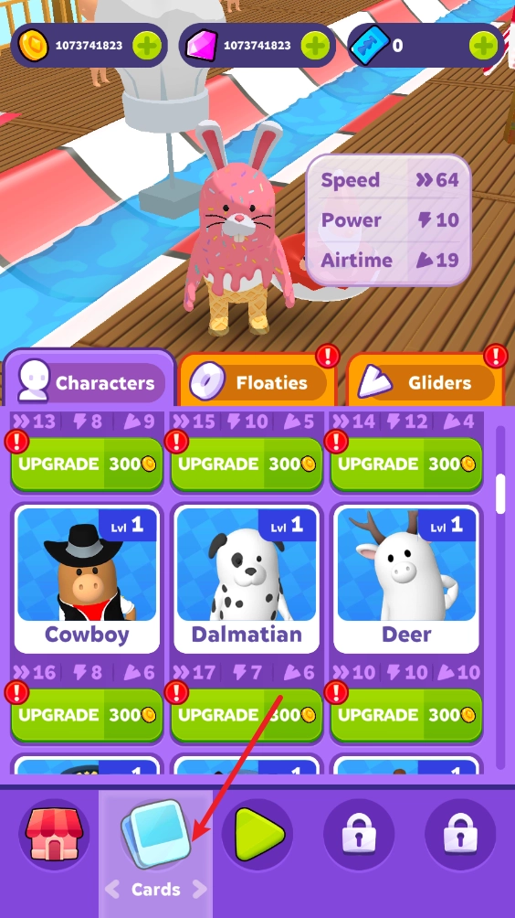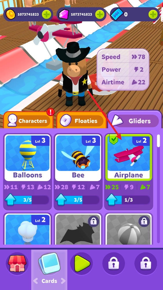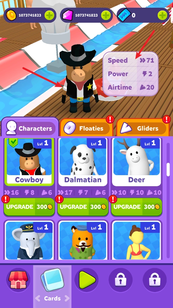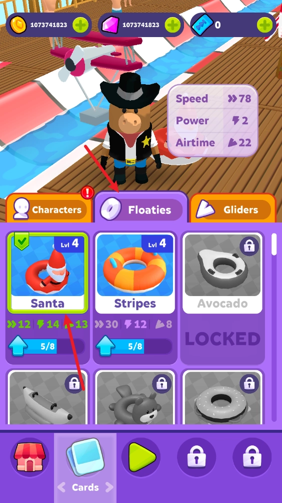 2、除了角色外,我们还可以自由的搭配不同风格的游泳圈或者是飞行道具,用个性的外观去进行比赛。
