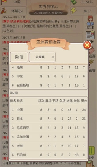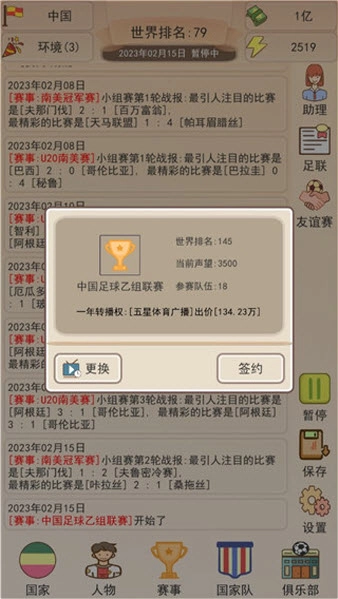 2、游戏主界面会显示当前中国足球的世界排名以及世界各地大小联赛的赛事信息。