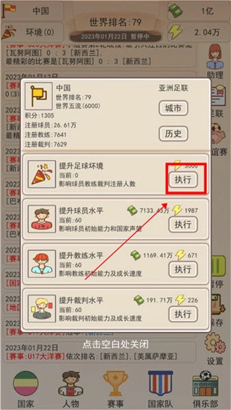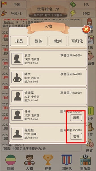 3、点击左下角的国家按钮可以提升足球运动的各个能力。