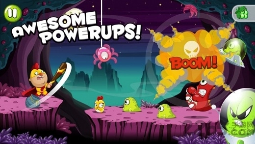 1. 小鸡超人借助水果子弹攻击怪物,当点击屏幕使力度条填满后松开,此时发射的水果子弹威力最强,可一次性消灭数只妖怪。