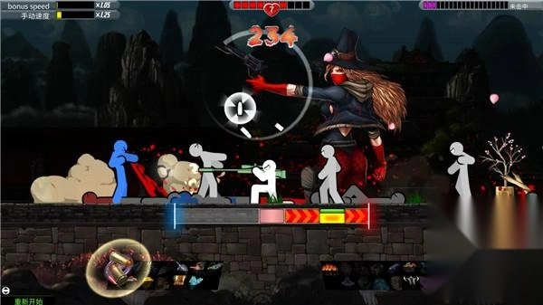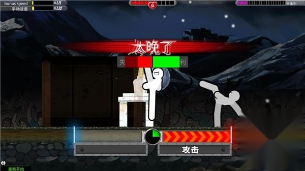 1、和一代相同,游戏的核心机制十分简单,全程仅需一个鼠标即可游玩:当敌人从左侧进入攻击范围时点击左键,从右侧靠近时点击右键,玩家操控的火柴人便会自动发起攻击,若点击过早或过晚都会受到惩罚。