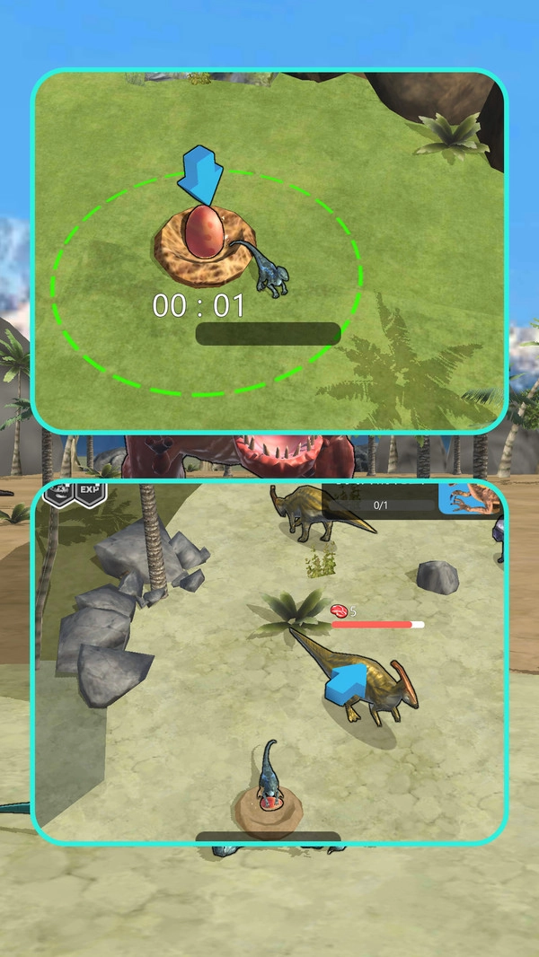 4、玩家可以通过探索收集不同种类的恐龙蛋,孵化并训练它们。