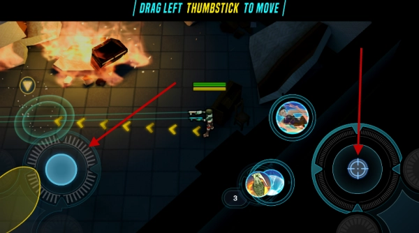 4、使用屏幕左侧的摇杆控制角色移动,使用右侧的摇杆进行射击。