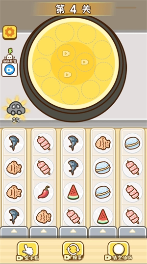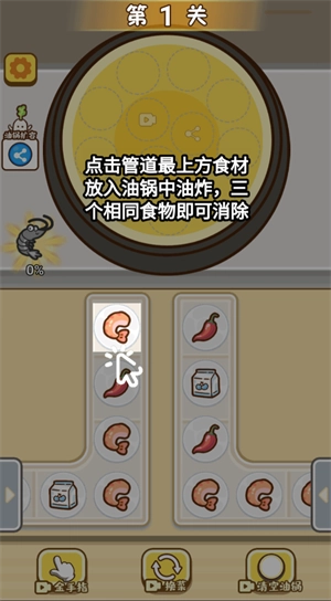 1、点击管道最上方的食材,将其放入油锅中油炸,当出现三个相同的食物时即可消除它们。